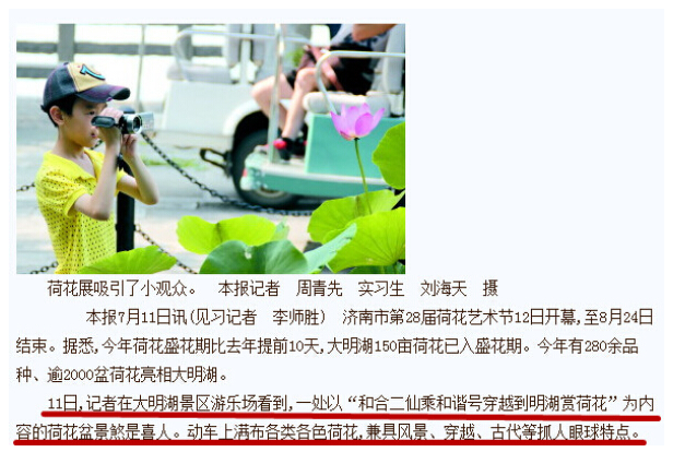 齊魯晚報C06版對園林公司制作的《和合二仙——寒山拾得的時空穿越》大型立體花壇進行了報道。此花壇以“欣逢泉城盛夏,寒山拾得二仙得知大明湖有荷展,特乘和諧號高鐵攜荷花穿越時空來到此處,為人們帶來吉祥如意并與游人同樂。”為設(shè)計制作理念。花壇一經(jīng)展出便吸引不少游客住足觀賞、拍照。