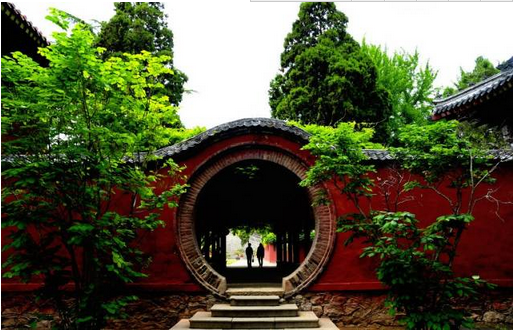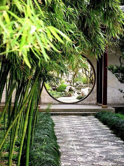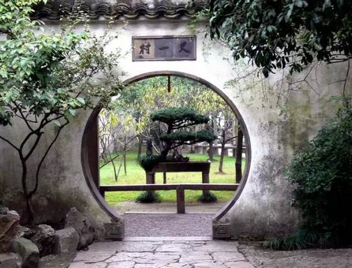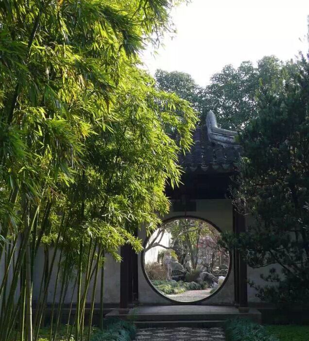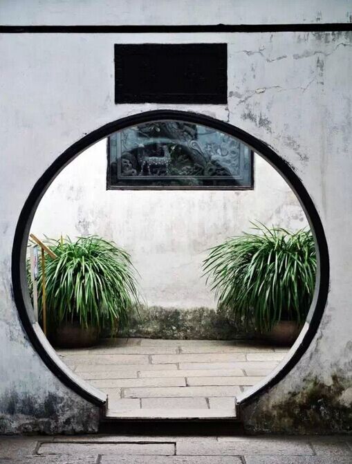 洞門僅有門框而沒有門扇,常見的是圓洞門,其作用不僅引導(dǎo)游覽、溝通空間,本身又成為園林中的裝飾。通過洞門透視景物,可以形成焦點突出的框景。采取不同角度交錯布置園墻、洞門,在強(qiáng)烈的陽光下會出現(xiàn)多樣的光影變化。